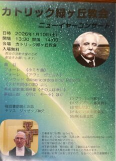 2026年 ニューイヤーコンサートのご案内 投稿公開日:2025年12月28日 投稿カテゴリー:お知らせ カトリック緑ヶ丘教会にてニューイヤーコンサートを開催いたします。 どなたでも無料でご入場いただけます。 日時 2026年1月10日(土) 開場 13:30 開演 14:00 会場 カトリック緑ヶ丘教会 おすすめ お知らせ(2025.6.8) 2025年6月8日 活動休止期間延長のお知らせ 2021年5月31日 おしらせ(2024.12.15) 2024年12月15日